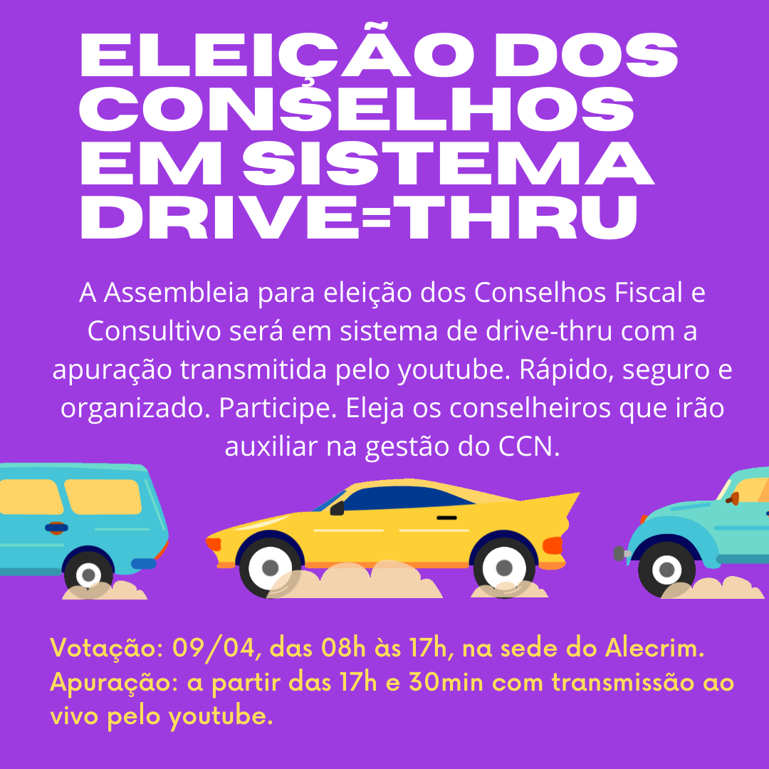 No dia 09/04, das 8h às 17h, realizaremos a eleição para os membros dos conselhos fiscal e consultivo. A eleição será realizada na sede do Alecrim em sistema de Drive-thru. A apuração será realizada em seguida com transmissão ao vivo pelo youtube.