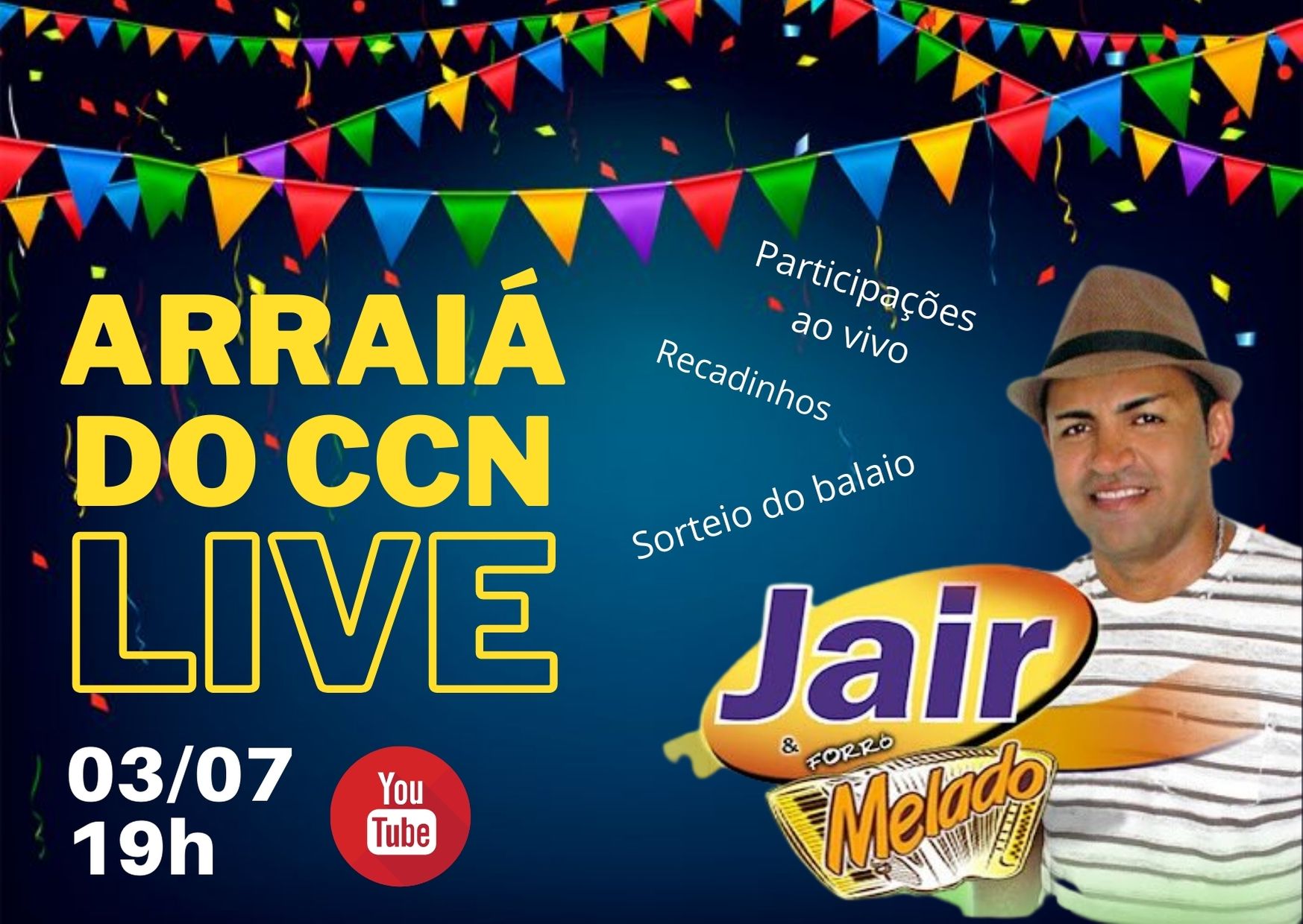 A Diretoria do CCN decidiu manter a tradição dos festejos juninos. Este ano o evento será realizado no dia 03 de julho, com início às 19 horas, no formato de LIVE transmitida pelo seu canal do Youtube. A atração musical da Live ficará por conta de Jair Forró Melado e convidados.